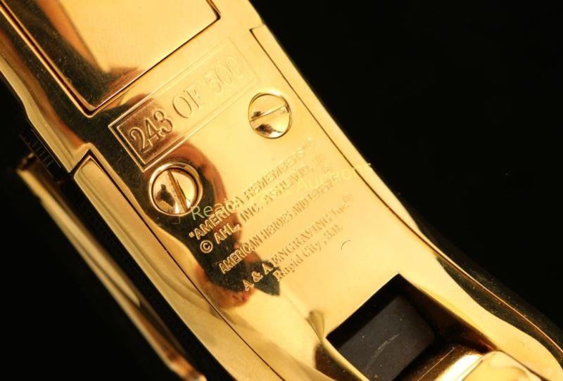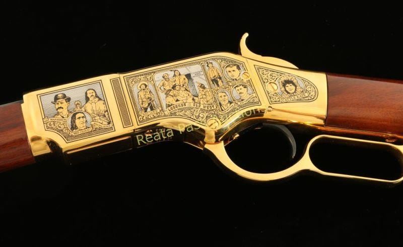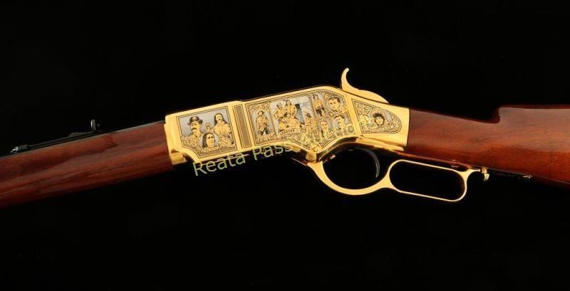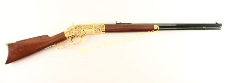 SN: W05453 Heavily adorned commemorative lever-action repeating rifle chambered in .44-40 Winchester, produced in Italy and distributed by Taylors & Co. Number 243 of 500, these limited edition rifles where made by America Remembers as a tribute to the legendary lawmen, outlaws, cowboys, Indians and scouts of the American West. Features a high polish blued/gold finish, 24.25" octagon barrel, blade front sight with set screw, adjustable buckhorn rear sight, full-length tube magazine, highly decorated receiver with portraits of various famous figures of the Old West, smooth trigger, checkered hammer spur, metal forend cap, high gloss smooth walnut forend and straight grip shoulder stock with crescent metal buttplate. Rifle exhibits approximately 98% of it's original finish showing minor handling marks and a few light dots of emerging surface rust scattered on the barrel. Action is crisp, bore is excellent and wood stocks are fine. Condition is near excellent. ***C&R Firearm*** ***Modern Firearm***