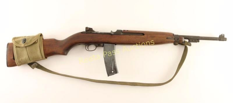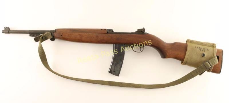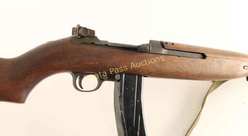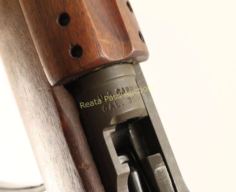 'Last Variation' U.S. Military contracted semi-automatic rifle chambered in .30 Carbine, circa 1944-1945. Features a parkerized finish, 18" Inland barrel dated 1-45, winged blade front sight, adjustable rear aperture sight, wide barrel band, bayonet lug, oval cut oiler slot, rotating safety, 30 round magazine, smooth trigger, round bolt, green canvas sling, four rivet smooth wood hand guard with narrow groove and pistol grip shoulder stock with low-wood forend, checkered metal buttplate & slip-on magazine pouch. Rifle retains approximately 85% of it's parkerized finish showing light handling marks, mild wear on the receiver & bolt from use and a couple light spots of surface rust observed on the barrel. Action is smooth, bore is excellent, and wood stock is near fine with few imperfections. Condition is very good. ***C&R Firearm*** ***Modern Firearm***
