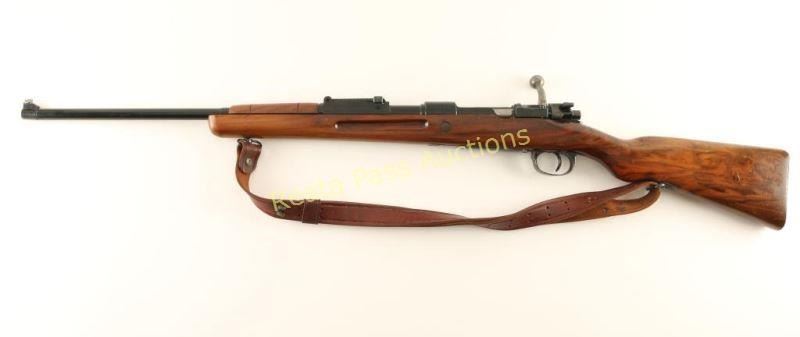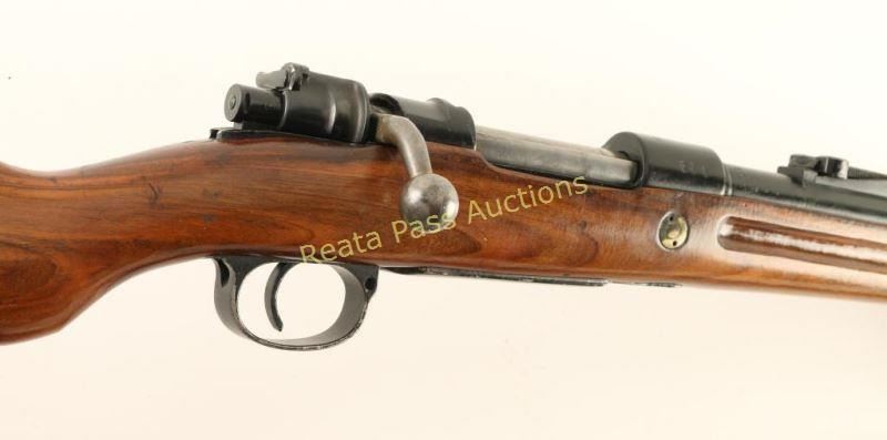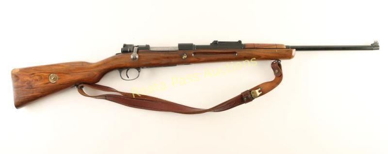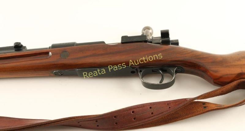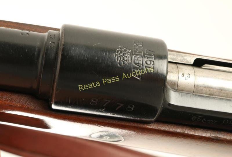 Sporterized German made bolt-action Mauser rifle, produced at the Amberg Arsenal circa 1917. Features a black refinish, 22 3/4" barrel, raised inverted 'v' front sight, graduated rear sight to 2,000 meters, internal box magazine, bent bolt handle, manual safety, rounded trigger, Hunter smooth brown leather sling, smooth short wood handguard and semi-pistol grip shoulder stock with smooth metal buttplate. Serial numbers are mismatched and the barrel is stamped "S17", "S/42G" and Eagle/WaA211 twice. Rifle retains approximately 90% of it's black finish showing edge wear, light scattered flaking and a couple small spots of pin prick pitting on the barrel under the finish. Action is smooth, bore is excellent and wood stock is very good+ with a small repair at the heel & minor blemishes. Condition is good as reconditioned. ***C&R Firearm*** ***Modern Firearm***
