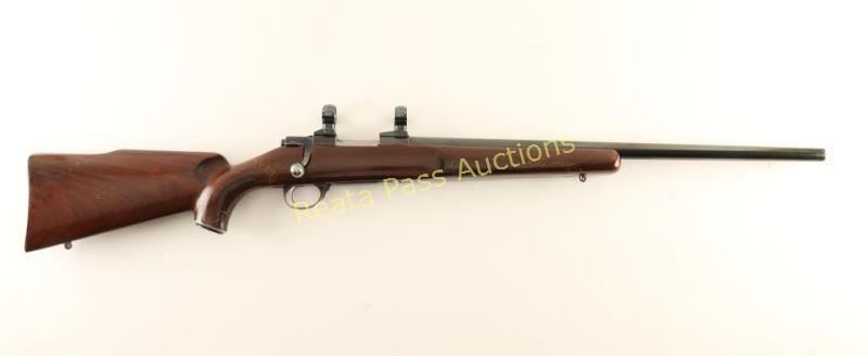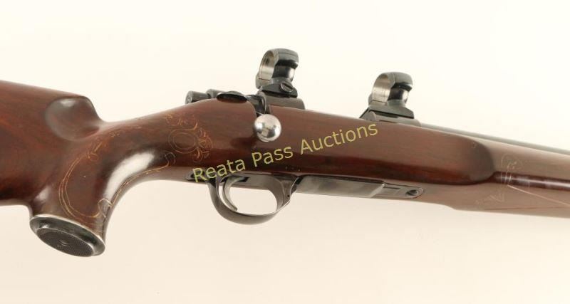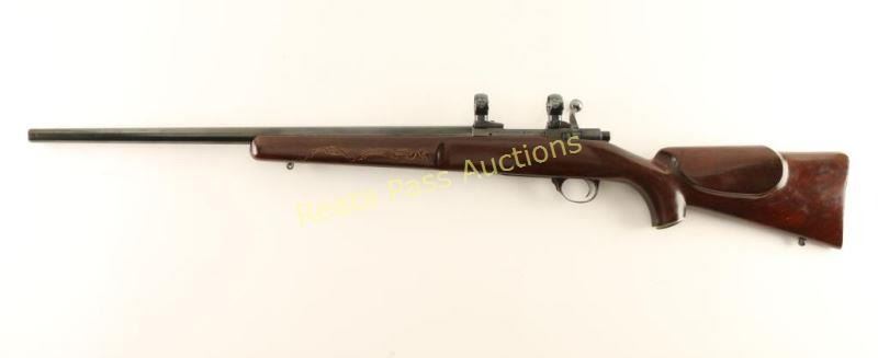Finish made bolt action sporting rifle chambered in .222 Remington, built off an L461 short action. Features a blued finish, heavy 23" barrel with no provisions for sights, installed scope bases with rings, internal box magazine with hinged floorplate, serrated trigger, swivel studs, manual safety and smooth wood pistol grip shoulder stock with beavertail forend, right handed cheek rest & palm swell and checkered metal grip cap & buttplate. Rifle retains approximately 85% of it's original finish showing areas of heavy wear on the barrel along with some handling marks & scratches. Action is smooth, bore is very good+ and wood stock exhibits ornate scratched designs on the wrist & forend which looks to be the beginning of fancy checkering. Condition is good to very good. ***Modern Firearm***