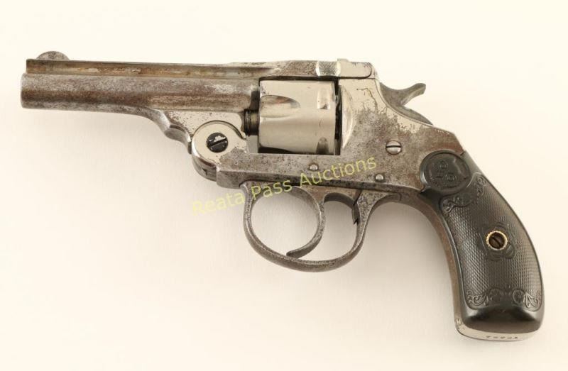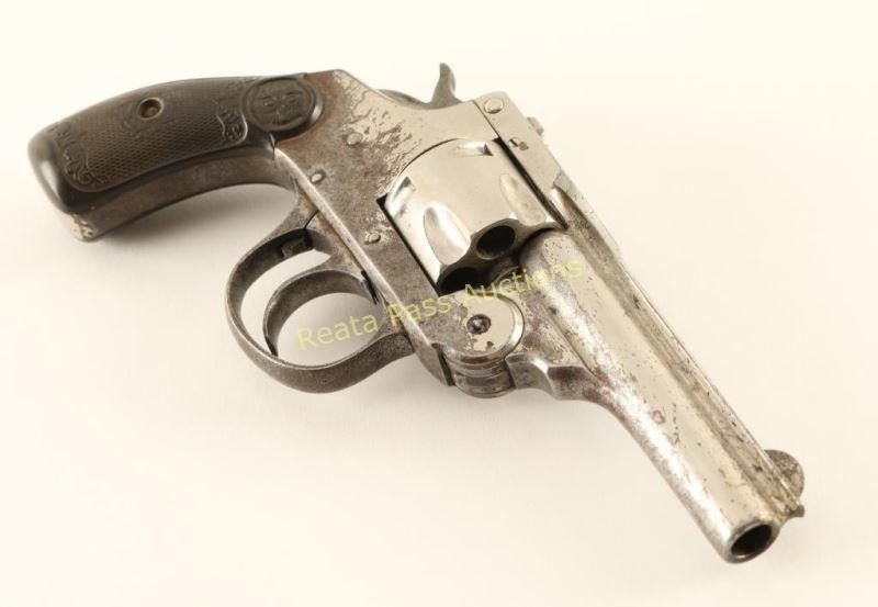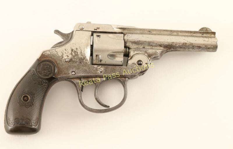 SN: 79751 Antique double-action five-shot revolver chambered in .32 black powder cartridge, circa 1894-1895. Features a nickel plated finish, 3" ribbed barrel, round blade front sight, notched rear sight, fluted cylinder, smooth trigger, checkered hammer spur, transfer bar safety, and ornate two-piece checkered black hard rubber grips with owl heads on the top of both panels. Revolver retains approximately 40% of it's original nickel plated finish showing heavy losses on the barrel and frame with light scattered pin prick pitting. Action performs well, bore is good+ with some rust and grips are very good. Condition is good. ***Antique Firearm***