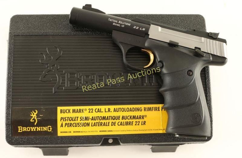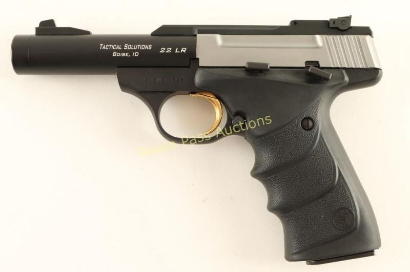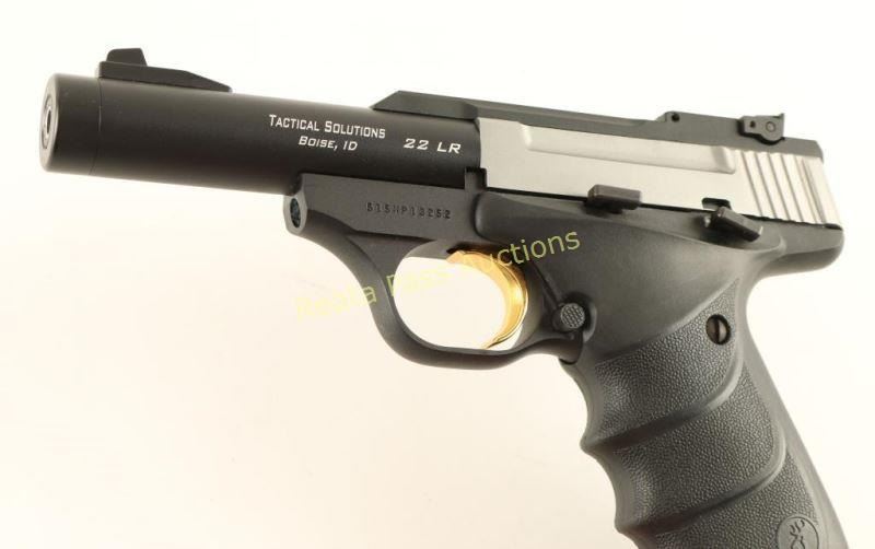 'Field Camper' Customized blowback-operated semi-automatic pistol chambered in .22 Long Rifle, circa 2008. Features a black finished 4" Tactical Solutions threaded barrel, ramped patridge front sight, adjustable rear target sight, stainless steel slide, black anodized frame, serrated gold trigger, thumb safety, push button magazine release, 10 round factory magazine, and Browning one-piece wrap-around black rubber finger groove grips. Includes the original factory hard case with document and tool. Pistol exhibits very little wear with only a couple minor scuffs observed on the frame, action is smooth, bore is excellent and rubber grips are fine. Condition is near new in box. ***Modern Firearm***