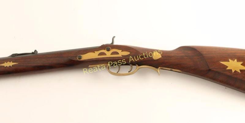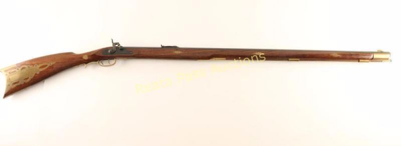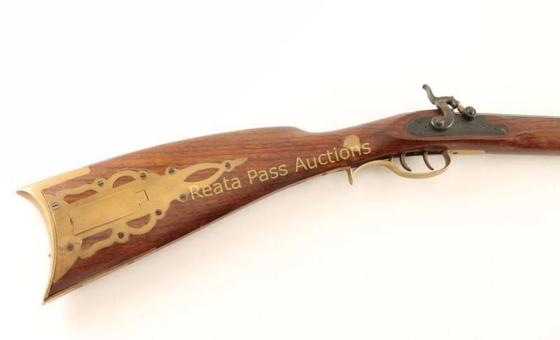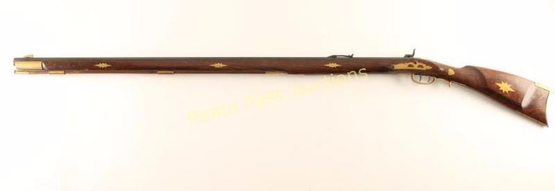 Blued and brass Black powder percussion rifle with a 40" octagon barrel, double set triggers, elevation adjustable rear sight, decorated floorplate and hammer, patch box and a full length wood stock. Barrel and hammer are blued a flat grey in color and the side plate is a brighter finish. Brass is all a brushed finish. The bore is dirty near the muzzle with strong rifling. The double set triggers are performing as designed. The wood is good with decorative brass heart and starburst designs. Condition is very good. *Antique Firearm*