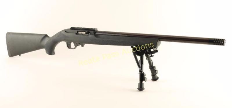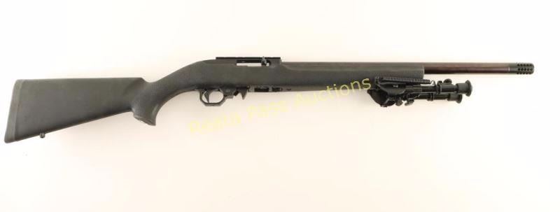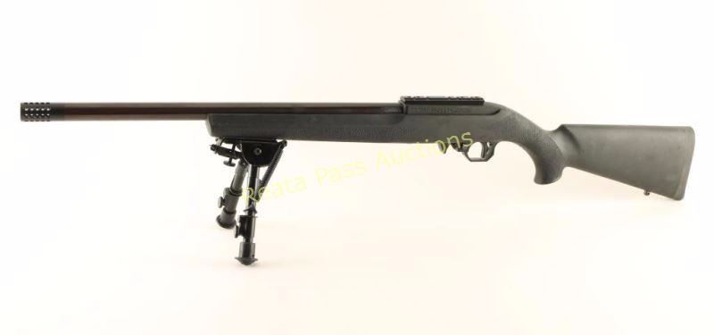 Customized semi-automatic sporting rifle chambered in .22 Long Rifle, circa 2010. Features an E. Arthur Brown Co. Fast Twist 18" threaded barrel with muzzle break & no provisions for sights, installed scope rail, black finished receiver, push button safety, factory 10 round magazine, Volquartsen trigger, adjustable folding bi-pod and Hogue pebbled black rubber overmolded pistol grip shoulder stock with integral recoil pad. Rifle exhibits approximately 98% if it's blued/black finish with a few bright spots of edge wear on the scope rail and a few fine superficial scratches observed on the barrel. Action is smooth, bore is pristine, and composite stock is fine. Condition is near excellent. ***Modern Firearm***