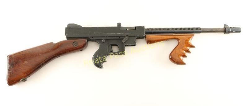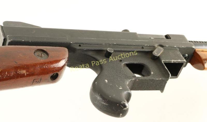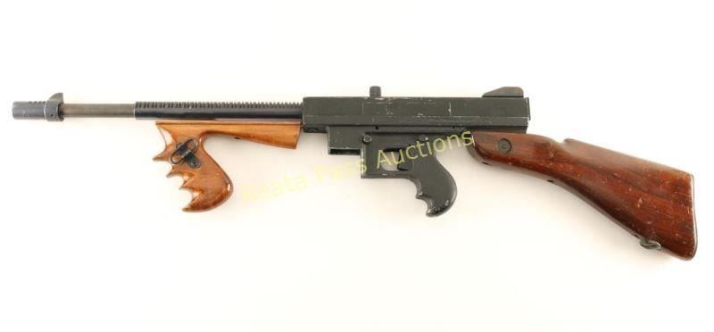 SN: 14822 Blued, painted and anodized, semi-automatic, detachable box magazine fed rifle with a 16.375" barrel, wood vertical foregrip, US military surplus detachable butt stock with trapdoor and no magazine. Rudimentary look alike of a Thompson 1928 submachine gun. Bluing has faded to grey with edge wear, scratches and surface rust freckles. Painted receiver has chips missing, rubs and scratches. Anodized compensator, barrel fins and lower receiver all have edge wear and scratches, scrapes and rubs. Bore is shiny with good rifling. Action works well. Foregrip appears to have been refinished and still has dings, dents and rubs overall. Butt stock has "LSA" cartouche on left side and "P" on bottom. Trapdoor has nothing in the hole beneath it. The receiver of the gun was crudely modified to accept the stock. Condition is fair. *Modern Firearm*