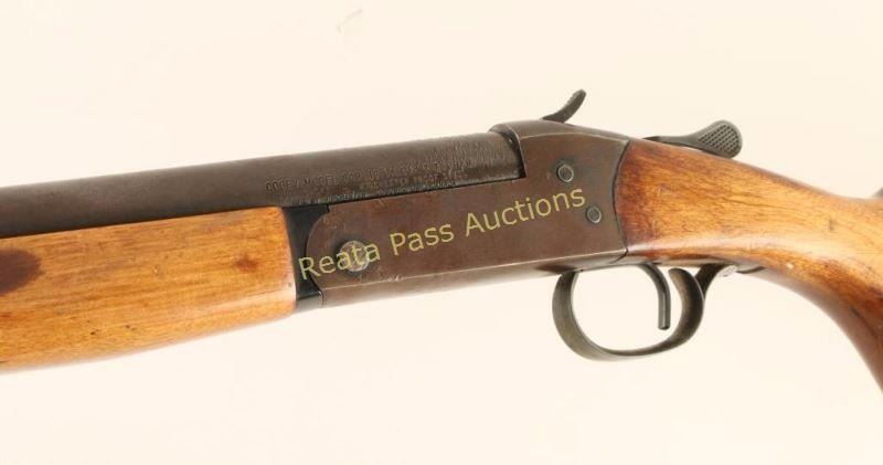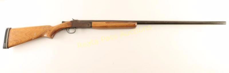 Canadian made single-shot shotgun chambered for 12 gauge shells, circa 1961-1967. Features a blued finish, full choked 36" barrel with 3" chambers with automatic ejector, brass bead front sight, smooth trigger, checkered top lever, smooth beavertail wood forend and pistol grip shoulder stock with oversized Pachmayer recoil pad. Shotgun exhibits little remaining finish with the majority of the metal surfaces turned to brown patina. The barrel also shows a high concentration of tooling marks near the breech. Action performs well, bore shows large amounts of shallow dark rust and wood stocks are very good. Condition is near good. ***C&R Firearm*** ***Modern Firearm***