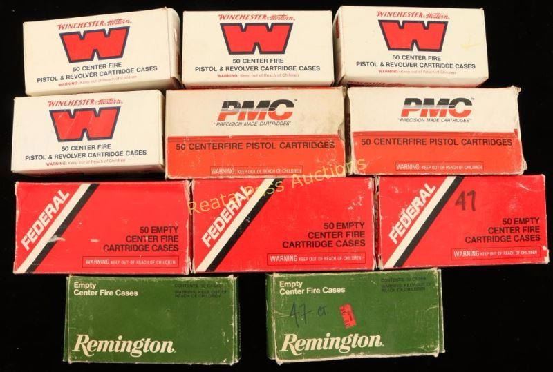 4 boxes of Winchester unprimed cases, 2 boxes of Federal unprimed, and 4 boxes of spent cases. Approx. 500