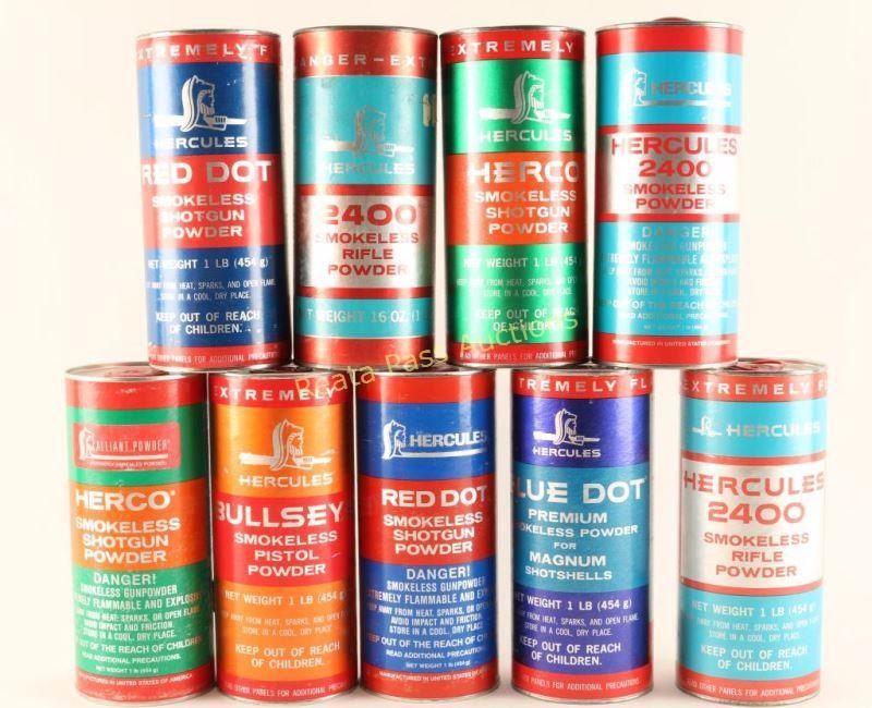 Includes 4 cans of shotgun powder, 2 cans of rifle, 1 can of magnum and more. Approx 9 lbs total.
