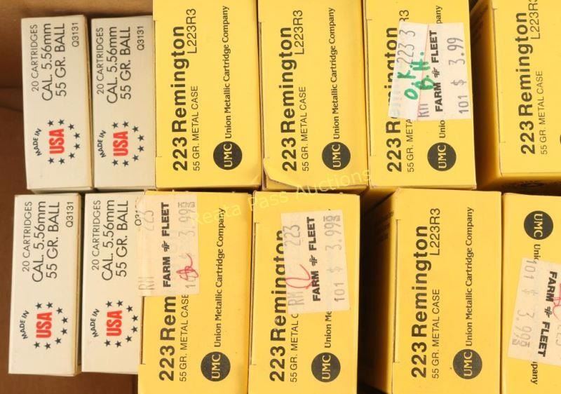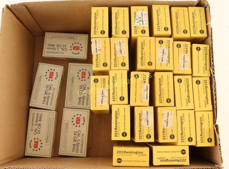 Includes; (25) boxes of UMC .223 55 grain metal case and (5) boxes of USA 5.56mm 55 grain ball.