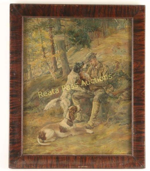 Depicting hunter with spaniels in the woods. Image measures 15 1/2"x19 1/2" in wood frame. Shows some age.