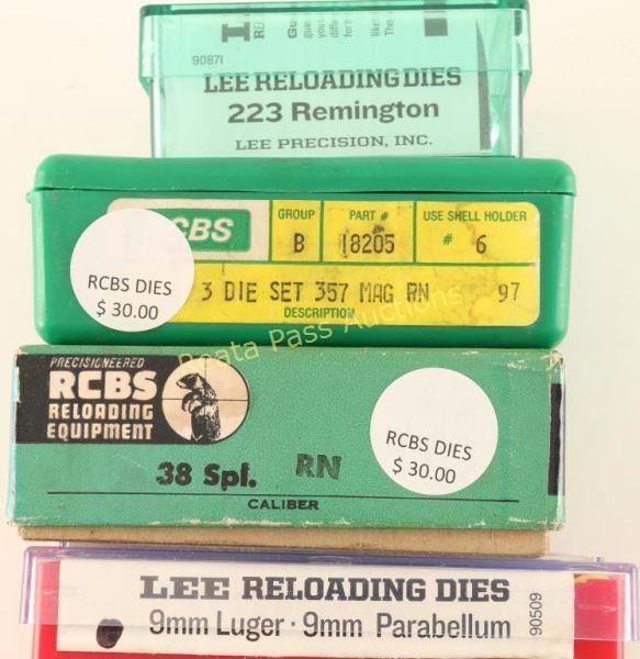 Includes 357-3 die set, 38 Spl, 9mm Luger, 223 Rem.