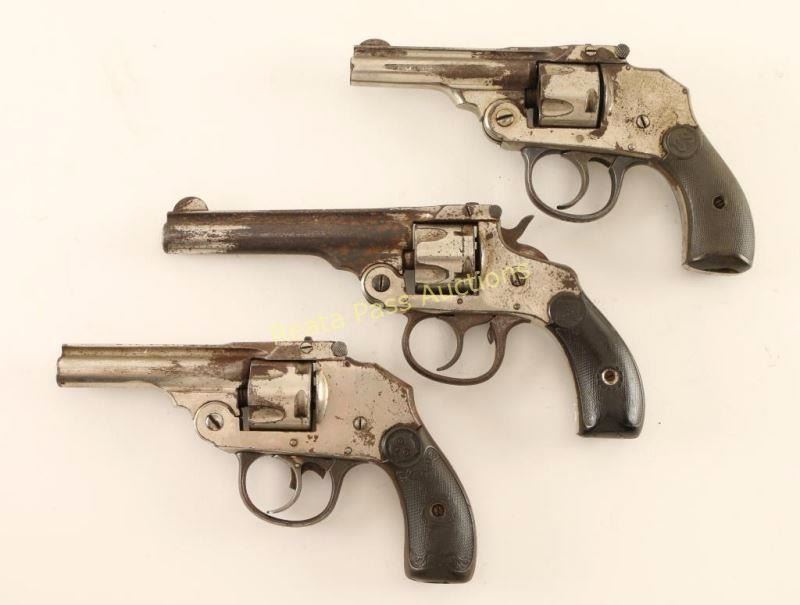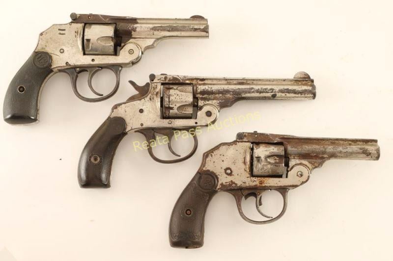 1) Harrington & Richardson 5-shot double-action top-break revolver. Bore is dark and pitted. Plated with rust. Missing pieces. 2) US Revolver Co. Plated 5-shot top-break hammerless. Bore is dark and pitted. Chambers are filthy. Plating is flaked and freckled. Action doesn't work. 3) Iver Johnson hammerless 5-shot top-break. Bore is dark and pitted. Plating is flaking and worn with perforations. Chambers are dark. Action works well with safety trigger. Both grips have chips out of the bottom.