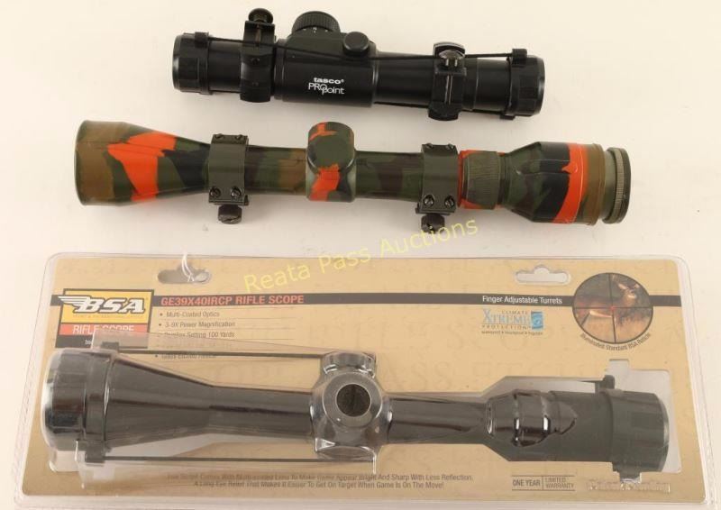 BSA 3-9X Power Mag GE39X40IRCP Scope, Tasco Pro Point, and Camo Rifle scope unmarked.
