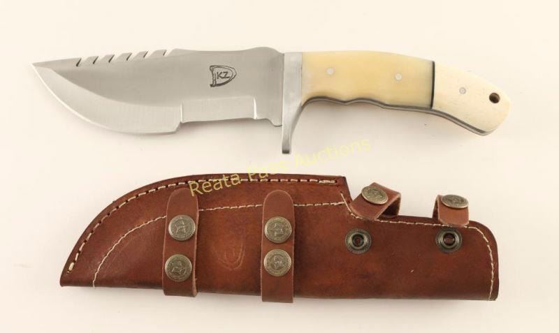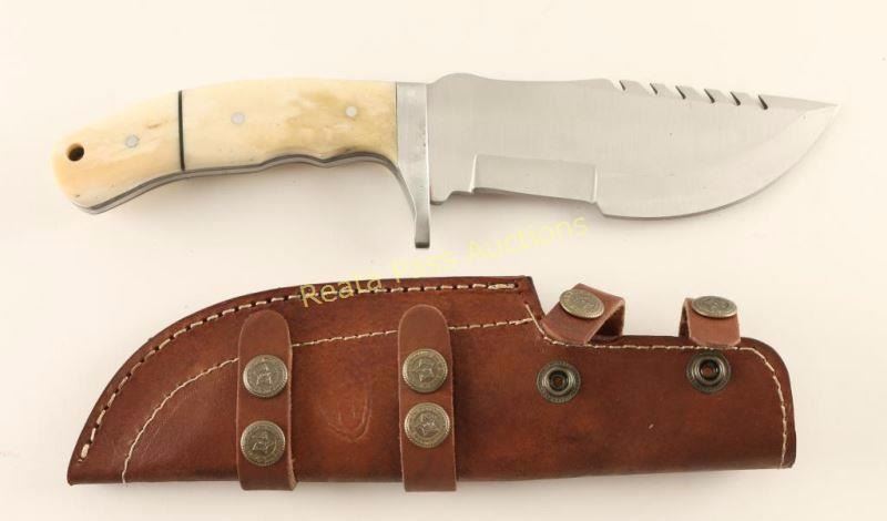 knife with Philippine bull bone handle. The tracker style blade is approx 6", and the handle is 5". The blade is custom forged super hard 440c stainless ball bearing steel. A high quality leather sheath is provided for hip, backpack, or concealed carry.