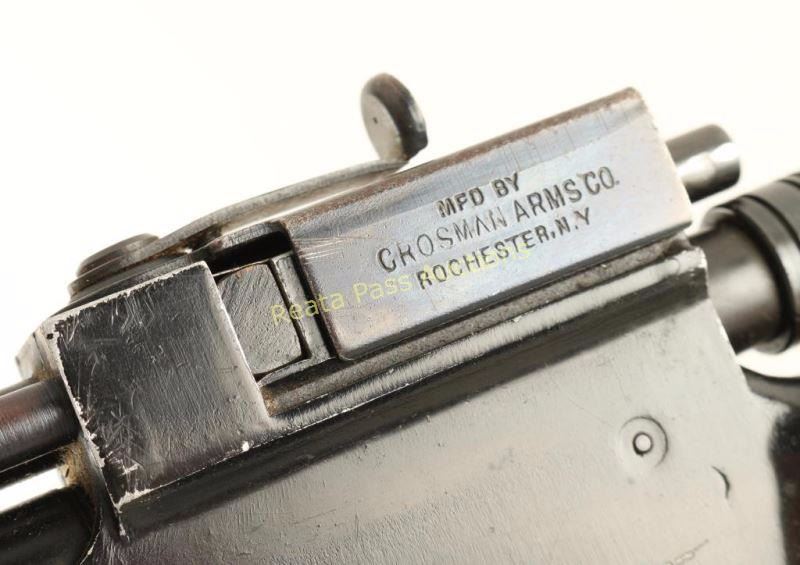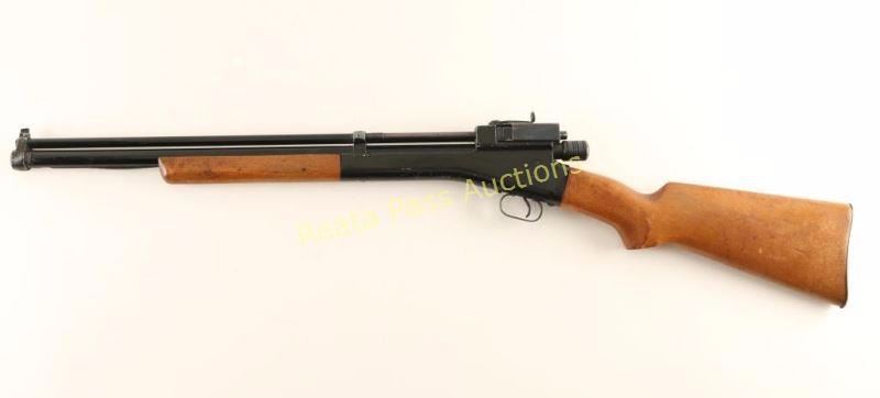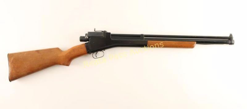 Vintage pump-action repeating air rifle chambered for .22 caliber ammunition, circa 1930's. Features a black finish, 20" barrel, blade front sight, aperture rear sight, side feeding tube magazine with cover, smooth wood pump handle and semi-pistol grip shoulder stock with metal buttplate. Rifle exhibits approximately 84% of it's black finish showing moderate handling marks and edge wear. The action does not seem to built pressure, bore is excellent and wood stocks are very good with some imperfections. Condition is very good+.