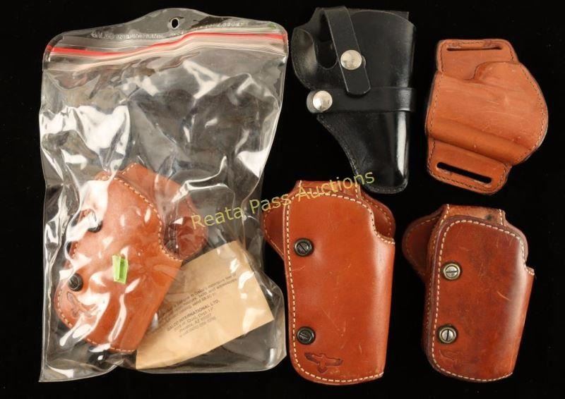Including; 3 Galco smooth brown leather holsters, 1 black Hunter, and 1 Bianchi smooth brown leather in various sizes.