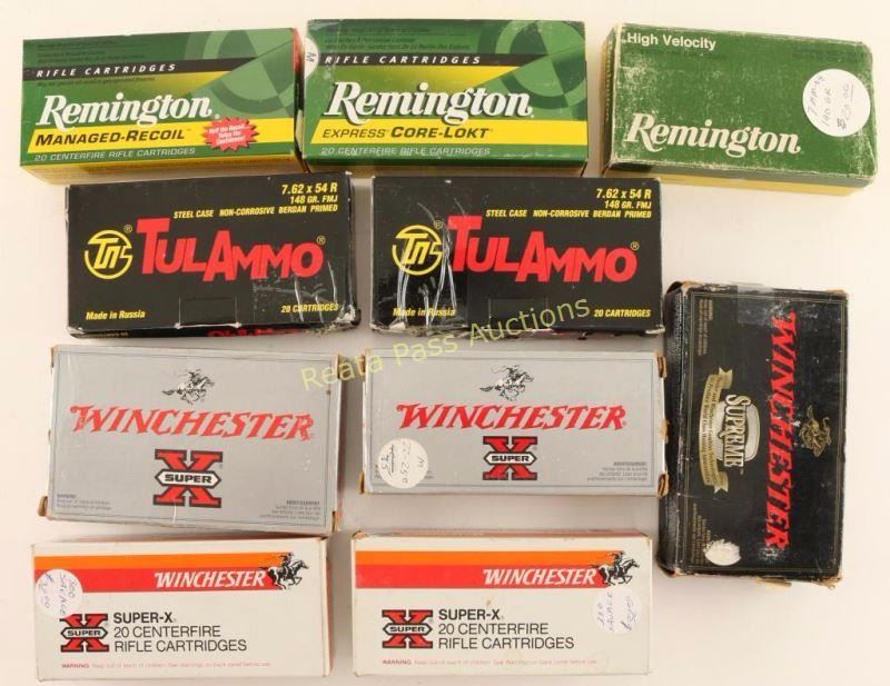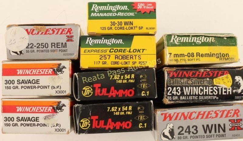 Includes 2 boxes of 243 Win, 2 boxes of 300 Savage, 2 boxes of 7.62x54R, 1 box of 22-250, 1 box of 257 Roberts, 1 box 7mm-08, and 1 box 30-30.