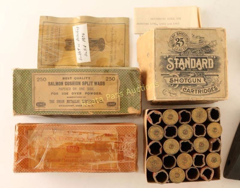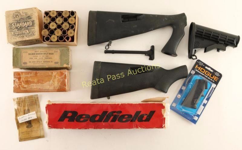 (3) Stocks(1) Hogue Grip for AR (1) Ideal Antique Reloading Booklet from 1904 (1)Selby Shotgun Cart (1) Salmon Cushion Wads (1) Pink Edge Gun Wads (1) Redfield Scope 3X-9X