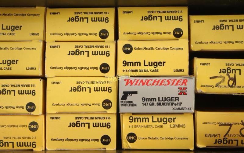 In ammo can, consists of twelve boxed of 50 round UMC 115 grain metal case and a Winchester 147 grain silver tip. Two boxes are marked reloads.