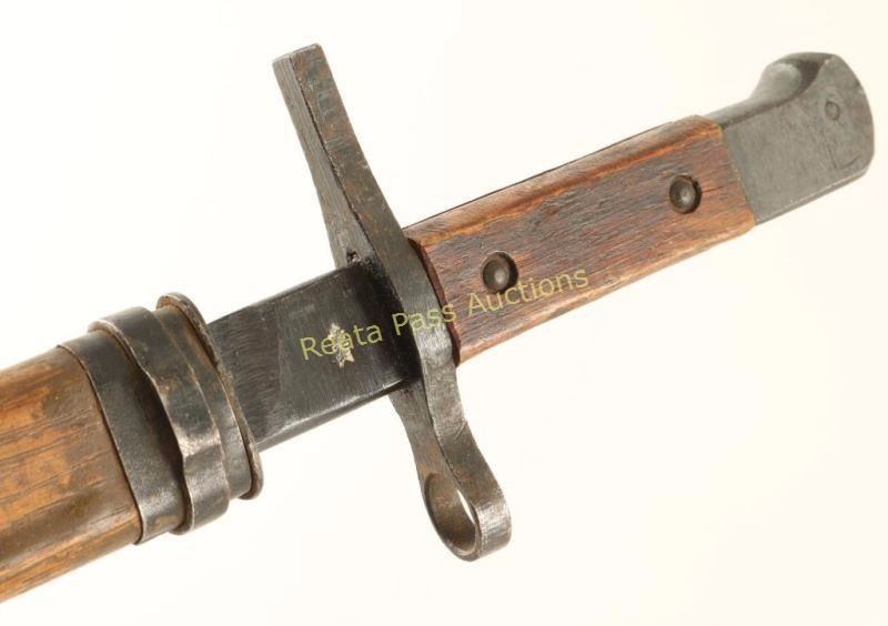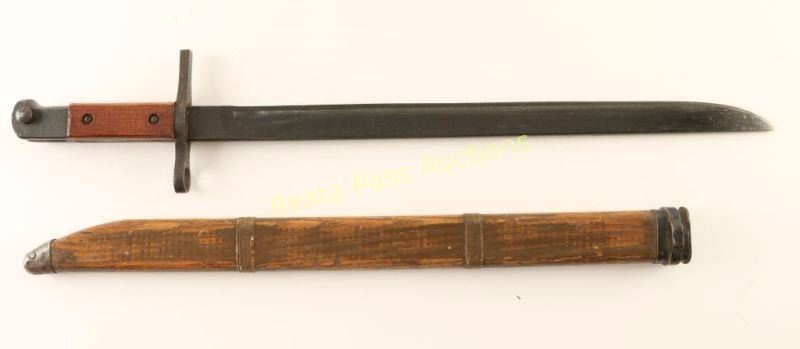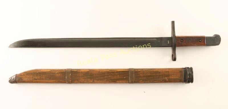 #1 with a serial number 70544. All metal construction with wood handle, 19 1/2" overall with a 14 1/2" blade and a wood sheath.