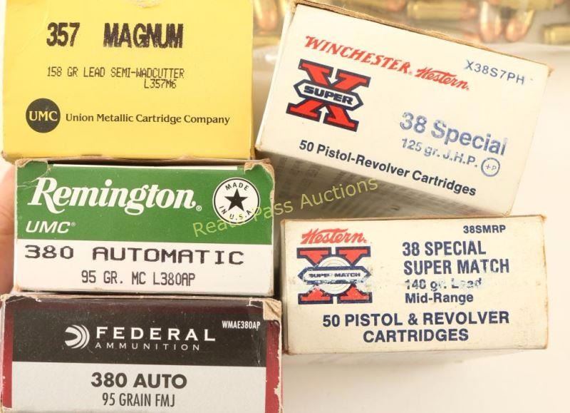 Consisting of (1) box of Western .38 Special Super Match, (1) box of UMC .357 Mag, (4) boxes of Remington .380 Auto Golden Saber, (100) rounds of 9mm and more.