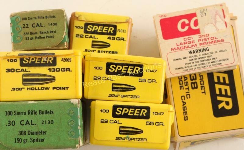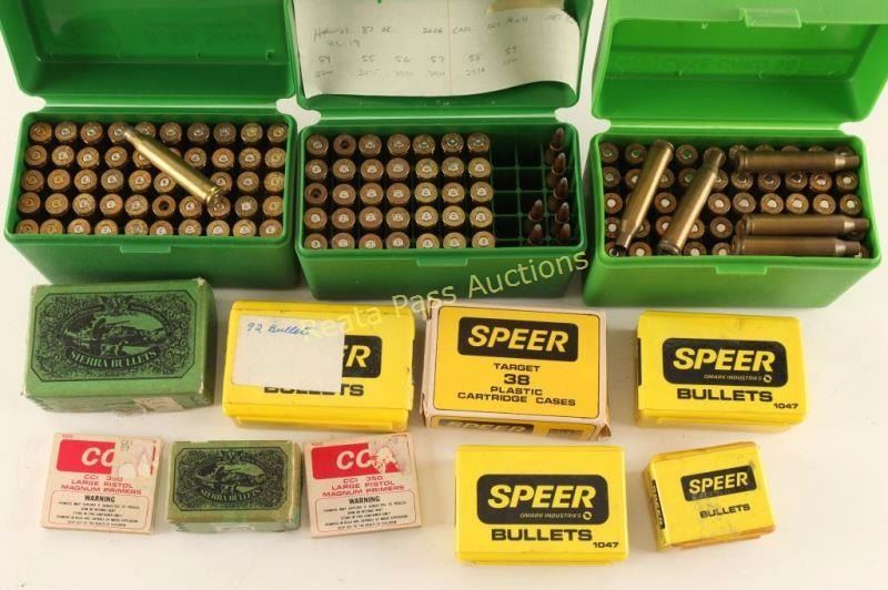 Including; 25-06 brass, Speer .22, Sierra .22, CCI 350 pistol primers, Sierra .30 and much more.