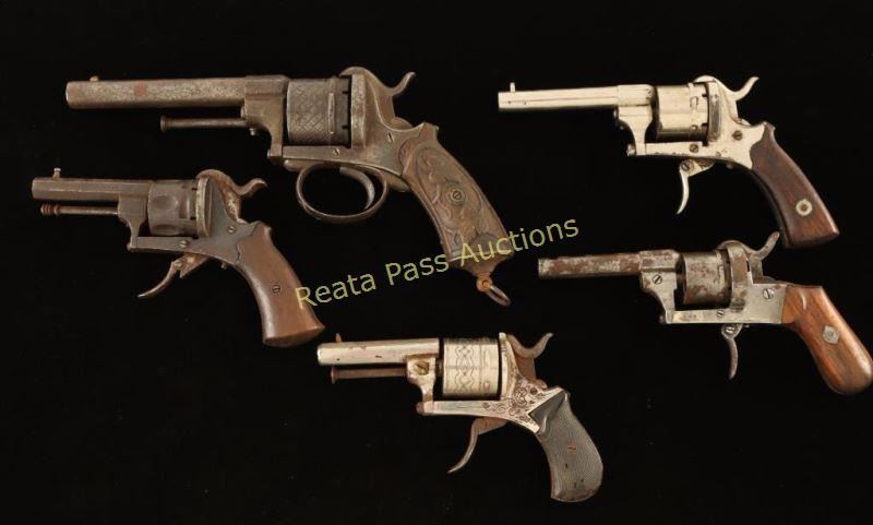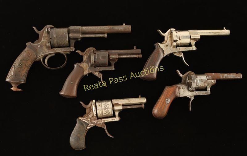 1) Plated and engraved open-top 6-shot folding trigger German center-fire revolver with what appears to be a bent frame giving massive cylinder gap. Action doesn't work and it can't be disassembled. 2) Belgian pinfire folding trigger 6-shot revolver. Lots of rust on the barrel which is loose from the frame. Trigger doesn't reset in double action. 3) Large 6-shot pinfire engraved and inlaid revolver. Barrel is loose. Trigger doesn't reset. Carved wood grips with chips. Missing loading gate. 4) Unmarked 6-shot pinfire revolver with plated finish and folding trigger. Plating has flaking and spots of corrosion. Missing ejecting rod. Action is stiff but works well. wood grips. 5) Belgian blued 6-shot pinfire revolver with a folded trigger. Bluing is heavily spotted with rust. Action doesn't work with out help.