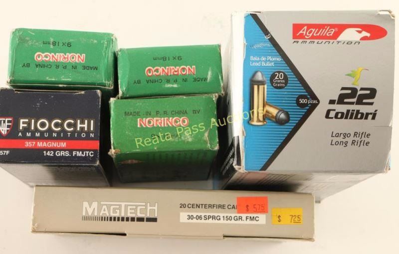 Including; Magtech 30-06 Sprg 150 Gr FMC-20 Rds, Fiocchi 357 Mag 142 Gr FMJTC-50 Rds, Norinco 9x18mm-150 Rds, and Aguila .22LR Colibri-500 Rds. All in original boxes.