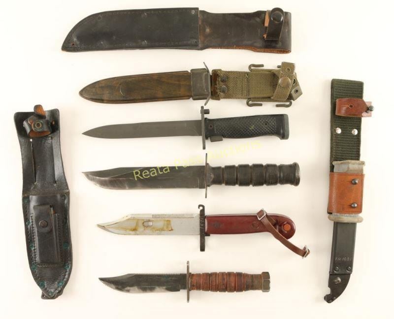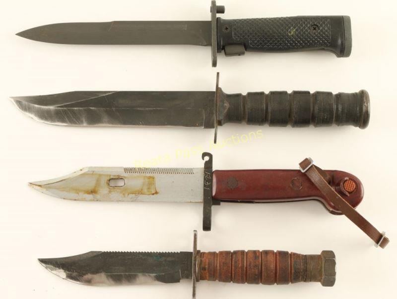 (1) AK bayonet with sheath, (1) Danish M1962 bayonet, and (2) Camillus fighting knives, with one marked U.S.