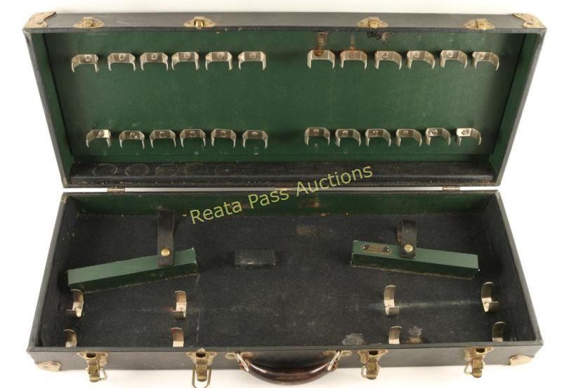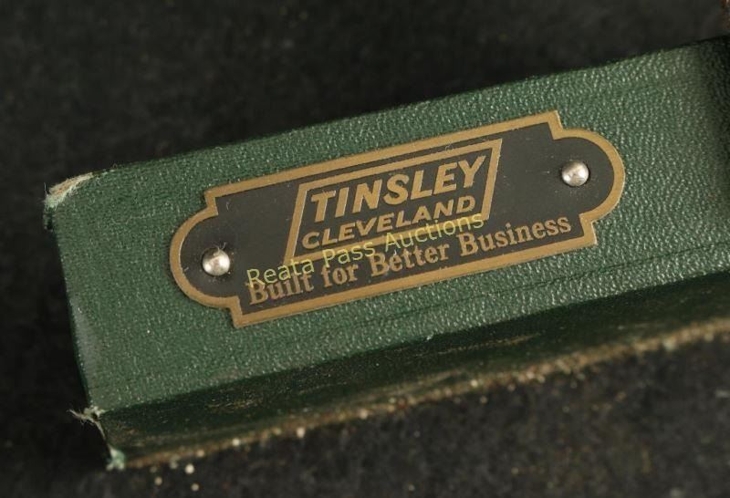 Faux leather covered case with brass hardware and leather handle. Interior has metal holders for flares on top and additional holders and area for gun below. Plate with 'Tinsley Corporation, Built for Better Business' on right wooden support.