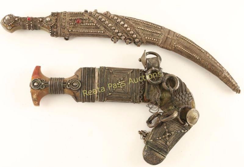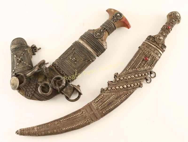 Jambia knives, both with ornate metal scabbards. 1 has metal beading with faux red stones and floral motifs-15" blade 20" overall, the other has geometric and basketweave designs-7 1/4" blade 12 1/2" overall approx. Both show age and use.