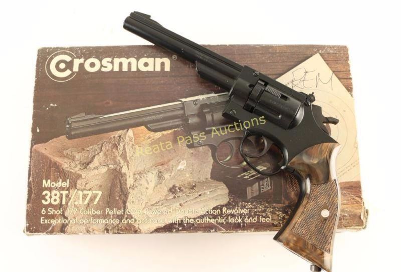 6 shot 177 caliber pellets, model 38T/.177 with authentic look and feel. The Crosman 38T is an excellent replica of the S&W K-38. All of the Crosman 38 series of pistols have metal frames with two-piece plastic grips. In original box with pellets, cartridges and Owner's Manual. Very good condition.
