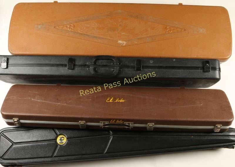 4 total-one Black Sheep with red faux fur lining and three Gun Guard cases-one of which has an elk scene molded into it.