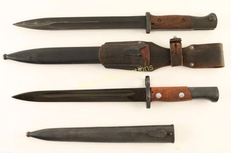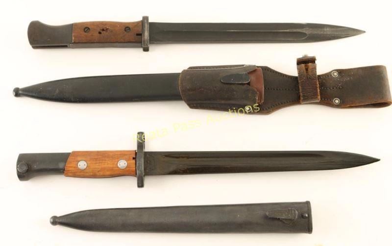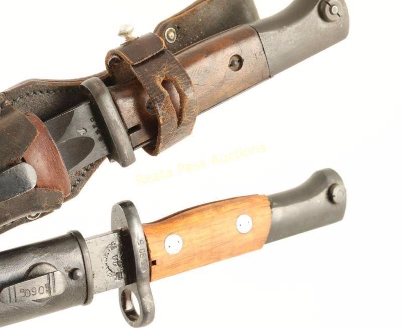 (1) Yugo M44 bayonet, ricasso and is marked '44', measures 15" overall with a 9" blade, metal construction with wood handle and metal sheath. & (1) German, marked 'JWH' and "8744p" on ricasso, metal construction, wood handle 15" overall 9" blade, metal sheath with leather hanger.