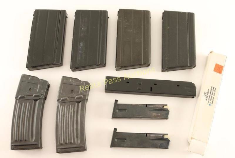 Including (4) 20 Round FAL magazines, (2) 25 round HK 93 magazines marked 5.56x45 HJ, (2) 15 round 9mm Beretta magazines and (1) 32 round IMI factory 9mm Uzi magazine in Action Arms box.