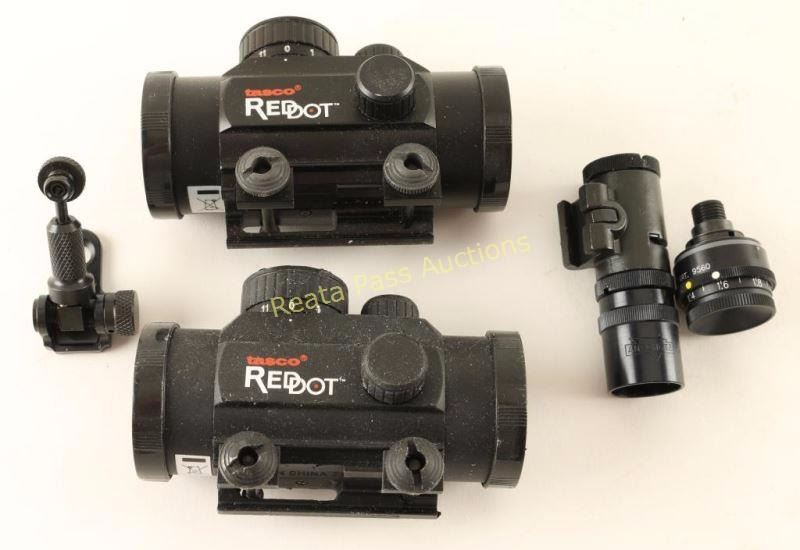 Including a diopter eye piece, tang peep sight, globe front sight and two Tasco red dot sights.