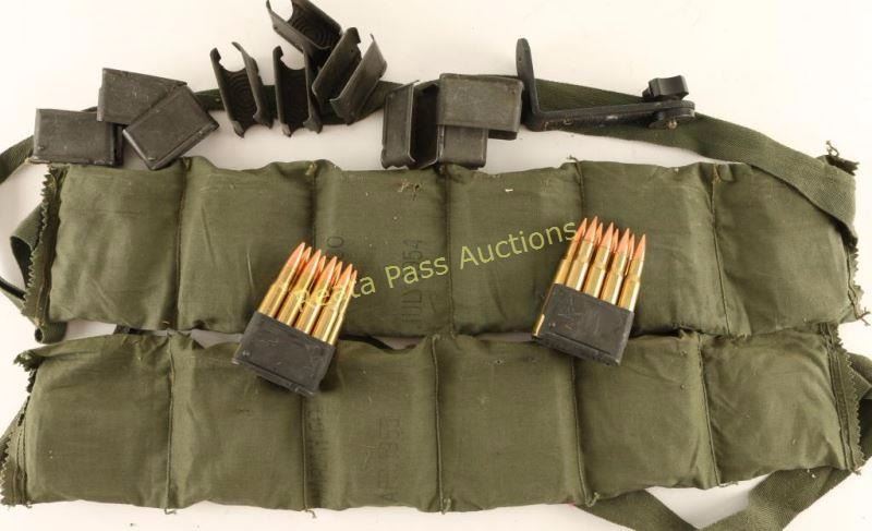 In twelve 8 round clips in bandoliers. Also include 10 empty Garand clips.