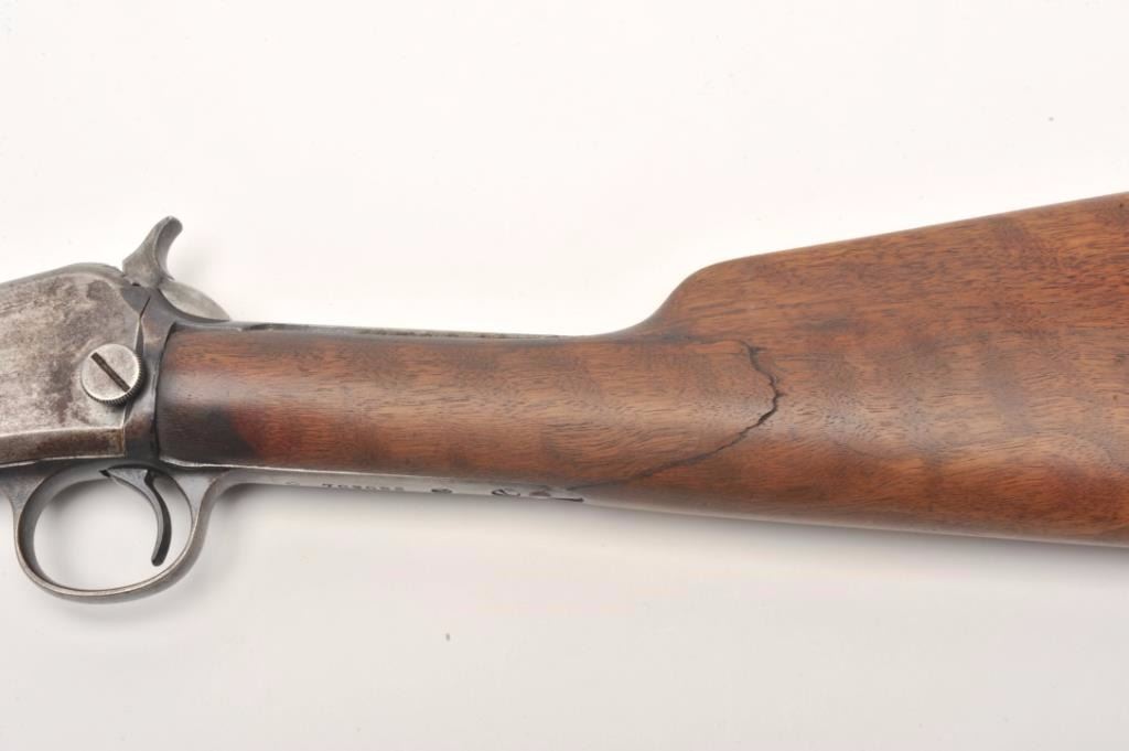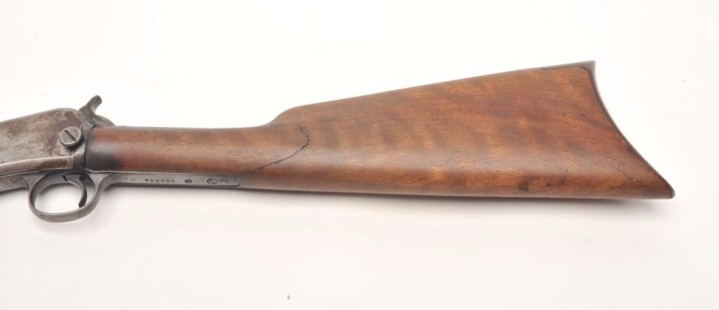 Winchester Model 1890 takedown pump rifle, .22 WRF caliber, serial #703025. The rifle is in good overall condition with a 24” octagon barrel with a knife blade front and replacement rear sights. The barrel retainsconsiderable amounts of its thinning blued finish with sharp edges and markings, while the ¾ length magazine has gone to a silver patina. The receiver is a silver/grey patina with some light surface rust noted. Thesmooth wood stocks are in rough condition with a poorly repaired brake at the wrist. The bore is fair, the action crisp and markings are sharp. (C+R) Est.: $75-150.