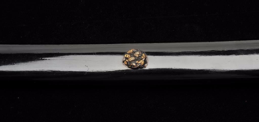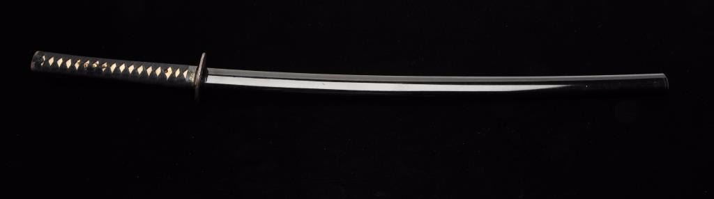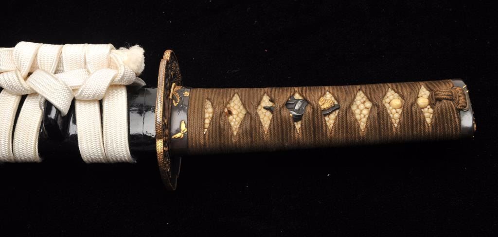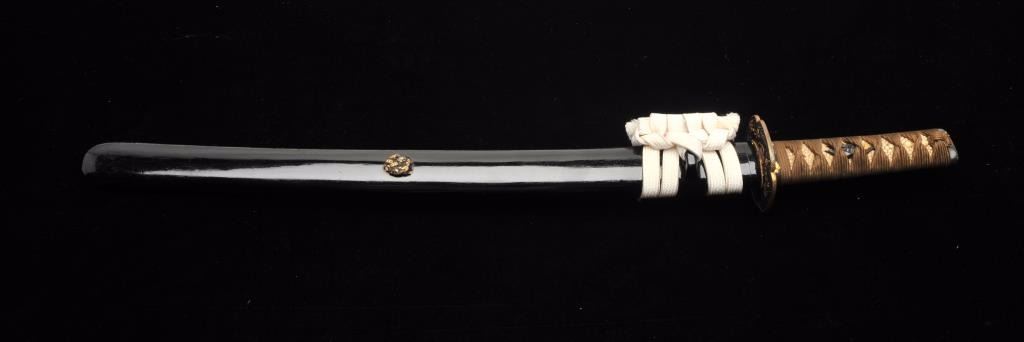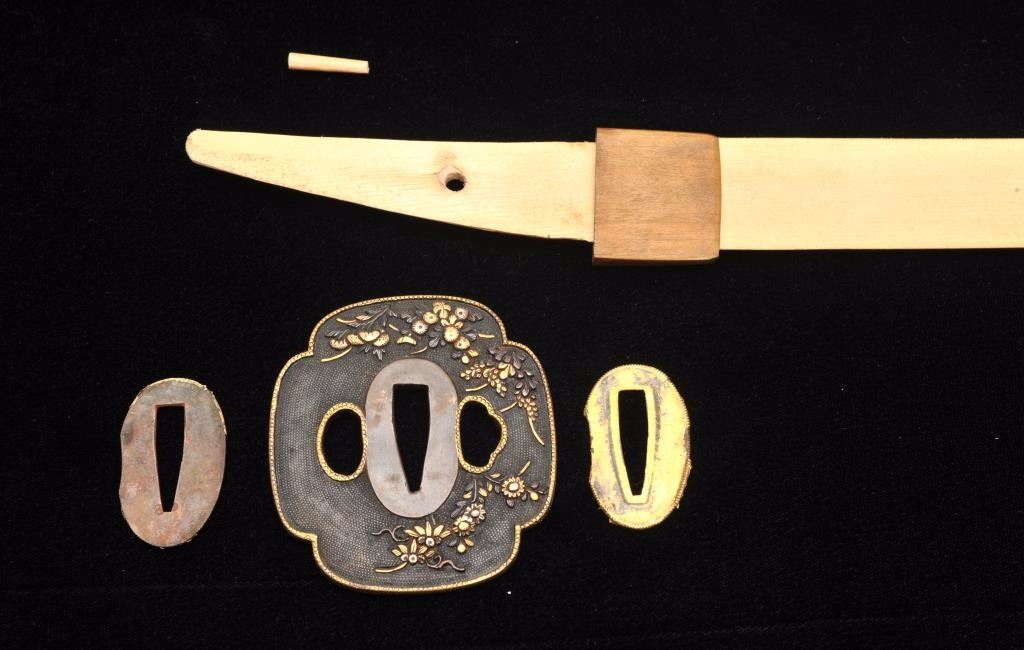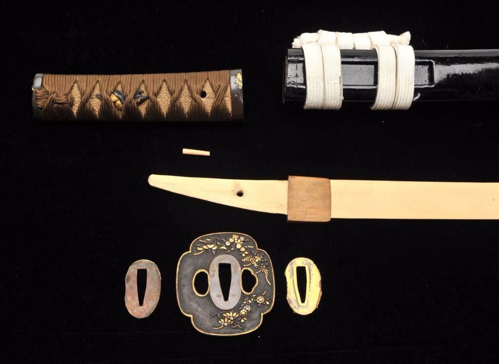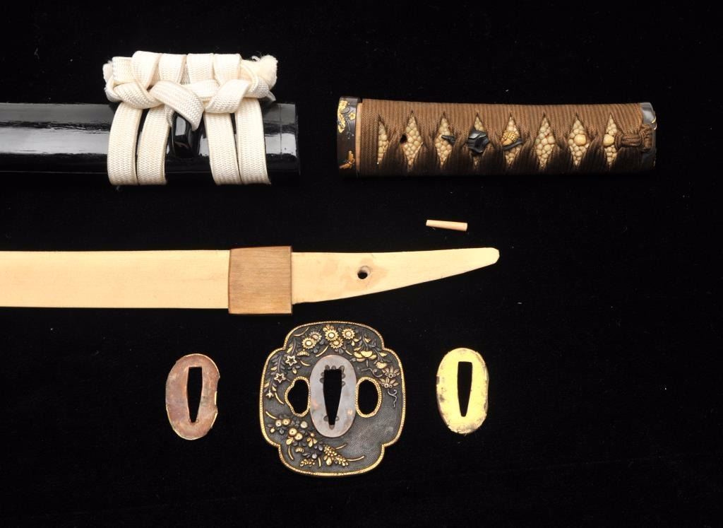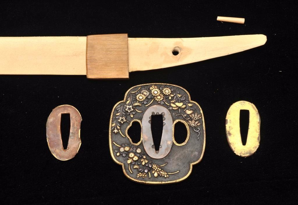 Lot 27 Mounts only for a Japanese wakasashi or medium size sword. The blade measures 18 ½”-19” and 1 1/8”