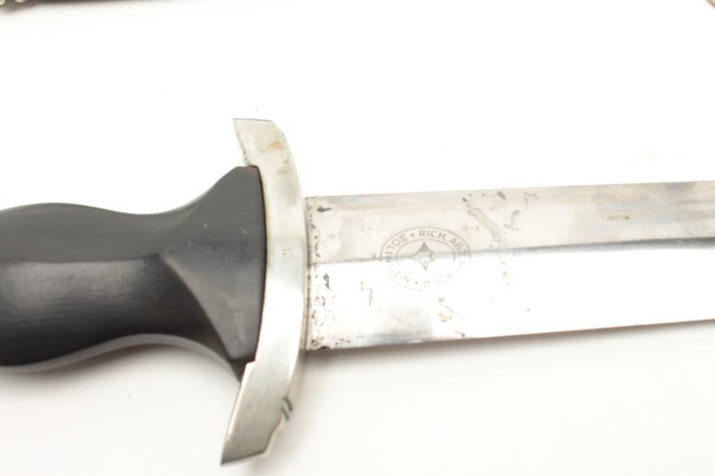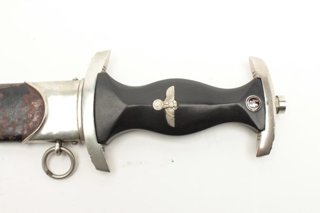 Post War German SS dagger with scabbard. Assembled from parts, the dagger is in good condition with a 13 ½” in total length with an 8 5/8” blade. The blade shows scabbard wear, staining, scattered pinprick pitting at the handguard and features an inscription. The blade is marked,” RICH. ABR HERDER SOLINGEN” at the handguard. The ebony handle features a German eagle emblem and SS inlays. The metal scabbard shows significant loss of finish and moderate surface rust with silver at the throat and toe and includes the hanger. Est.: $300-600.