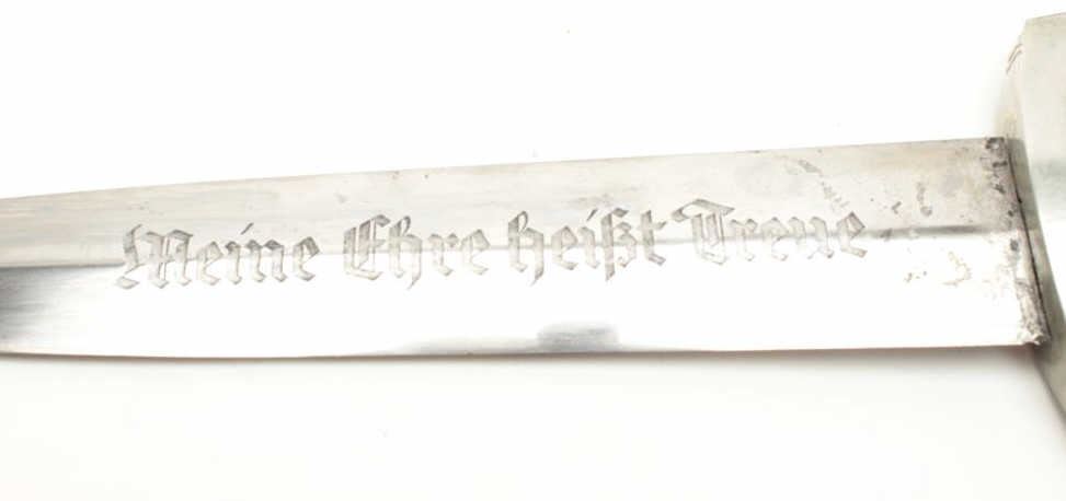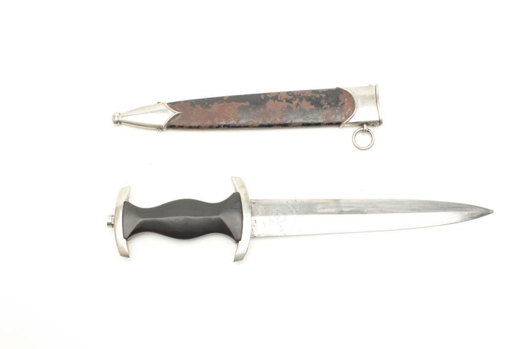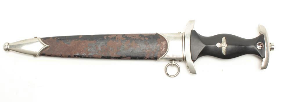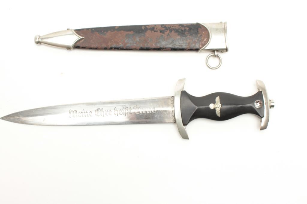 Lot 34 Post War German SS dagger with scabbard. Assembled from parts, the dagger is in good condition wi