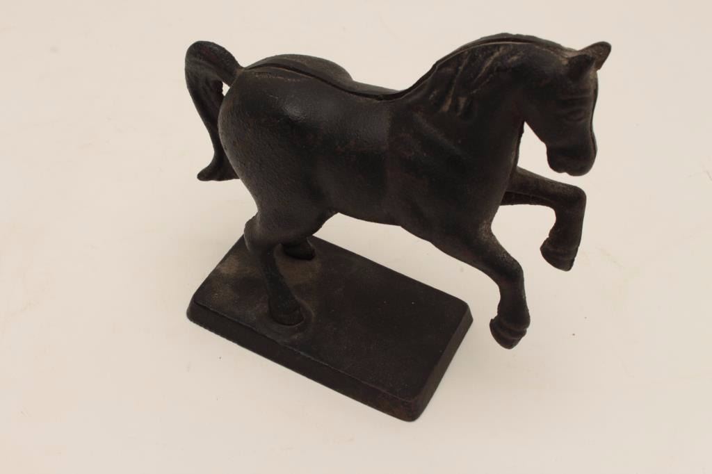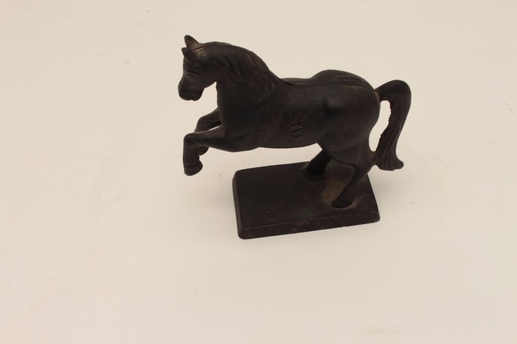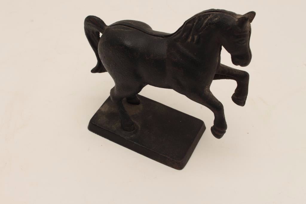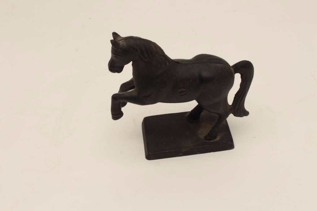 Lot 37 Cast metal bank in form of rearing horse; A. Stultz, Mercantile Co., established 1849; most paint