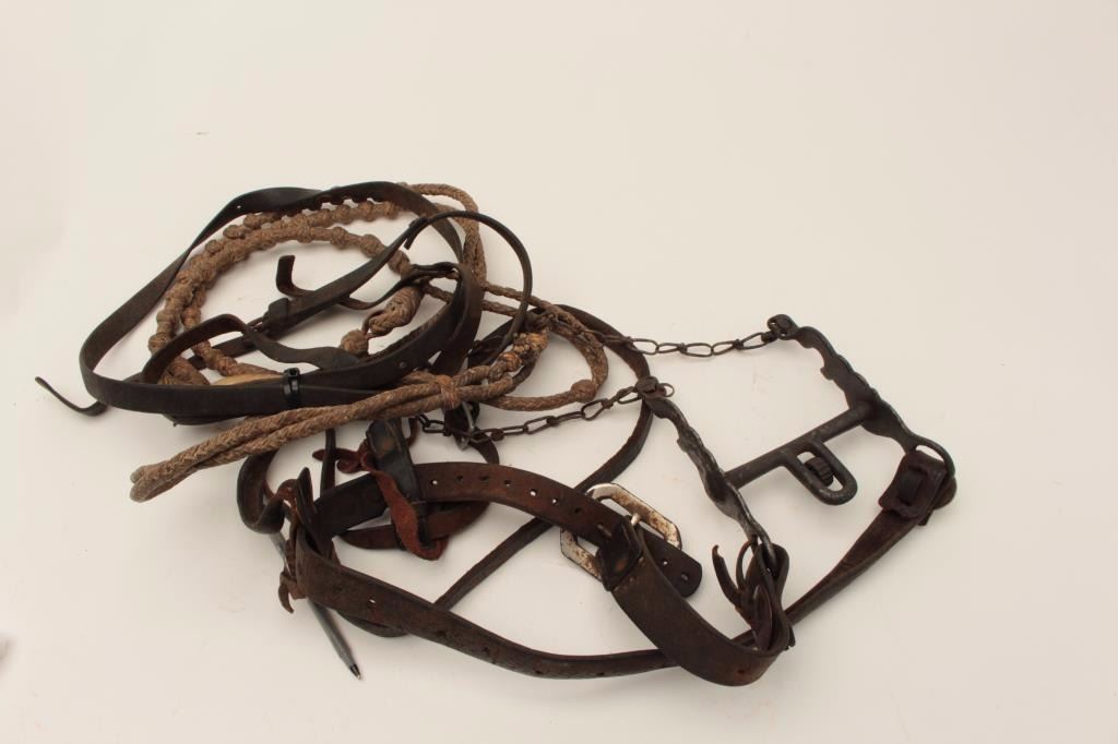 Hummingbird bit with old silver plated over iron with old leather headstall and reins; turn-of-century mid-to-Northern California or Santa Barbara-style. Est.: $150-$300.