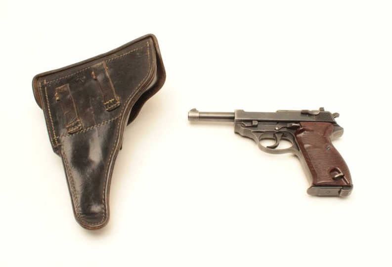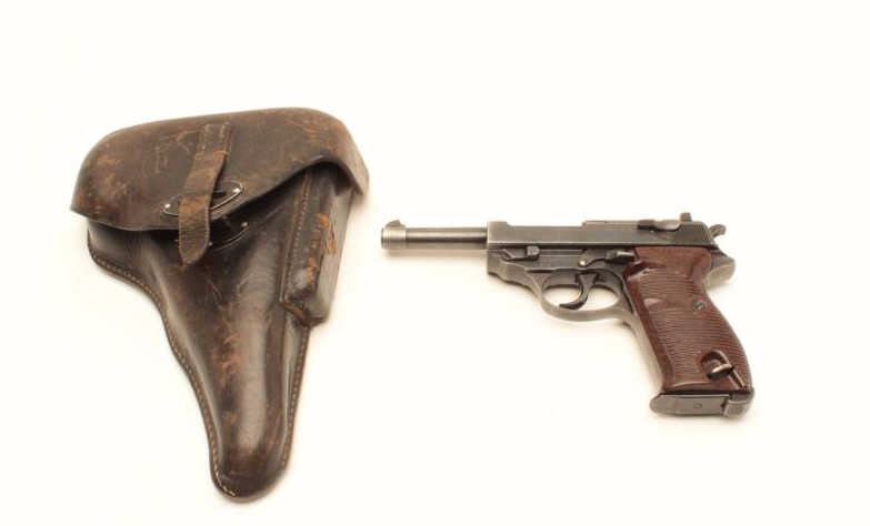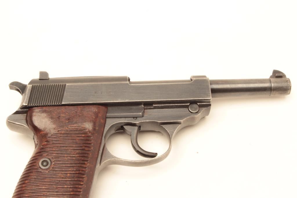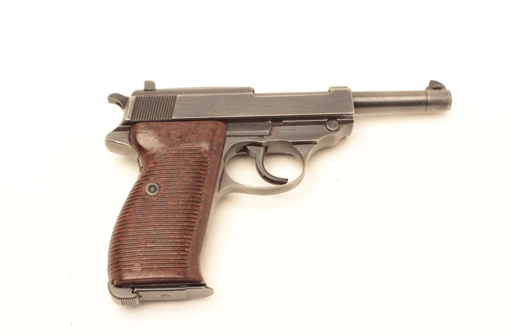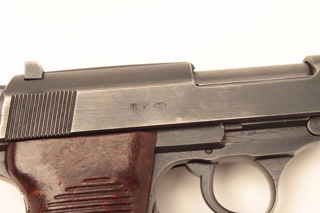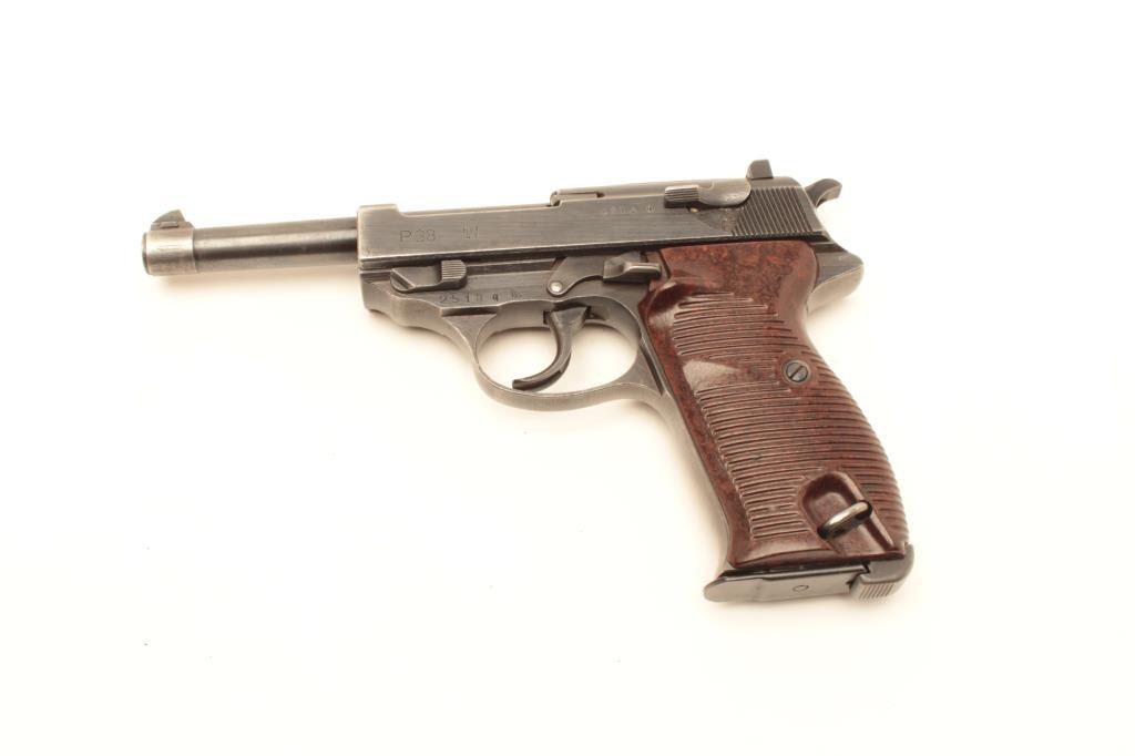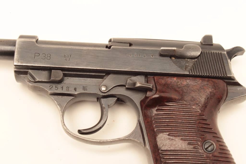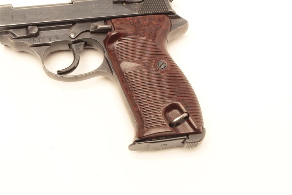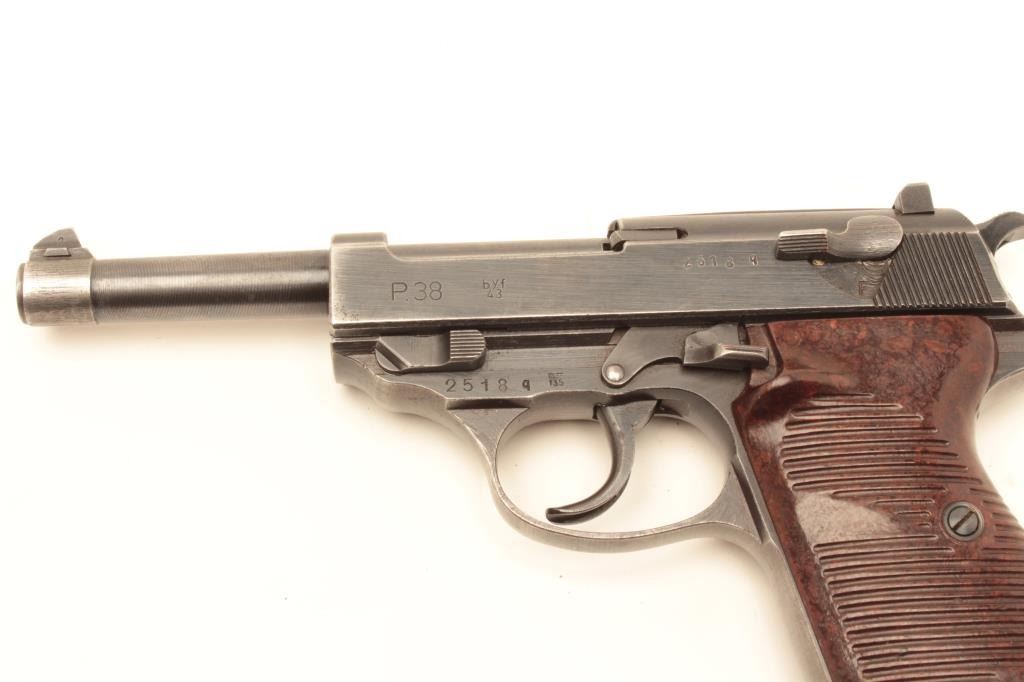 Mauser P-38 semi-automatic pistol, 9mm caliber, 5” barrel, bfy 43-marked, military blue finish, maroon grips, S/N 2518q, in overall very good + condition displaying the majority of its military finish, very goodbore, crisp action and markings, very good grips. Accompanied by a military leather flap holster with one extra magazine. (C&R/PPT). Est.: $600-$1,200.