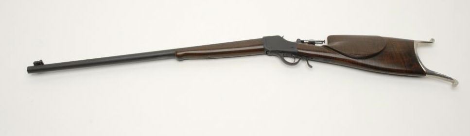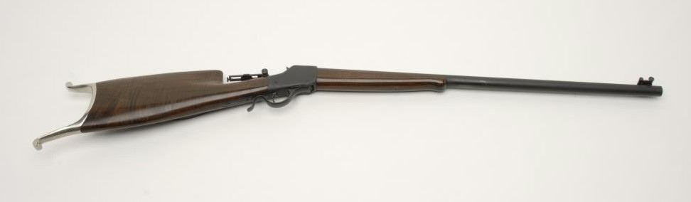 Custom Winchester Hi-Wall single shot rifle, .22 cal., serial #119367. The rifle is in very good condition as customized with a 28” round, Douglas premium bull barrel. The barrel retains nearly all of its matte blackfinish with an Axtell front sight with windage and level. An Axtell mid-range tang sight has been added as well. The action has been re-finished in matte black as well. The smooth wood stocks are in very goodcondition as re-stocked. The butt stock ends with a beautiful, schuetzen style nickel butt plate. According to the consigner, the rifle was built by Dan Dryer and stocked by the consigner himself. The bore is excellent and the action is crisp on this custom Hi-Wall. Note: stock broken and repaired, good job. Tight joint, almost imperceptible. Est.: $500-1000. (C+R).