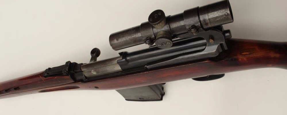 Tokarev Model 1940 semi-automatic sniper rifle, 7.62 caliber, 26” barrel, military finish, wood stock, S/N C6819 (all matching visible including magazine); mounted with a 1941-dated Russian scope with crispoptics. This rifle is in overall very good + condition displaying the majority of its military finish to metal surfaces, very good bore, crisp action, sharp markings and very good stock with 1940 under 5 point star onright side of butt stock; some scattered dings and mars from carry and storage. (C&R/PPT). Est.: $1,750-$3,500.