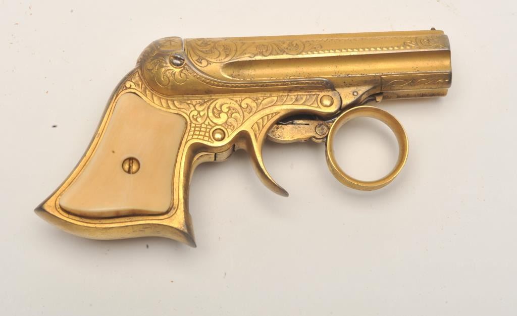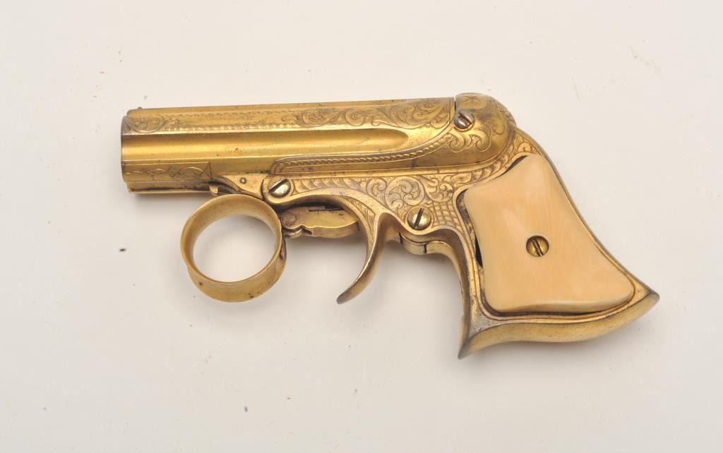 Lot 112a Remington Elliot pepperbox derringer, five-shot, ring trigger, engraved, gold wash finish, .22 cal