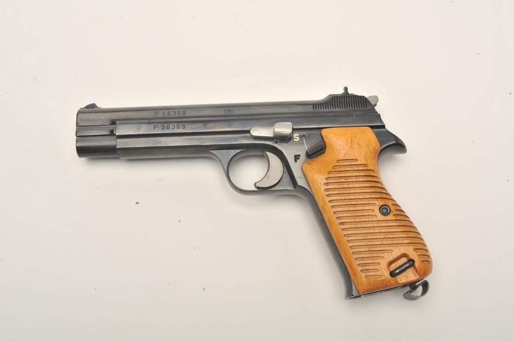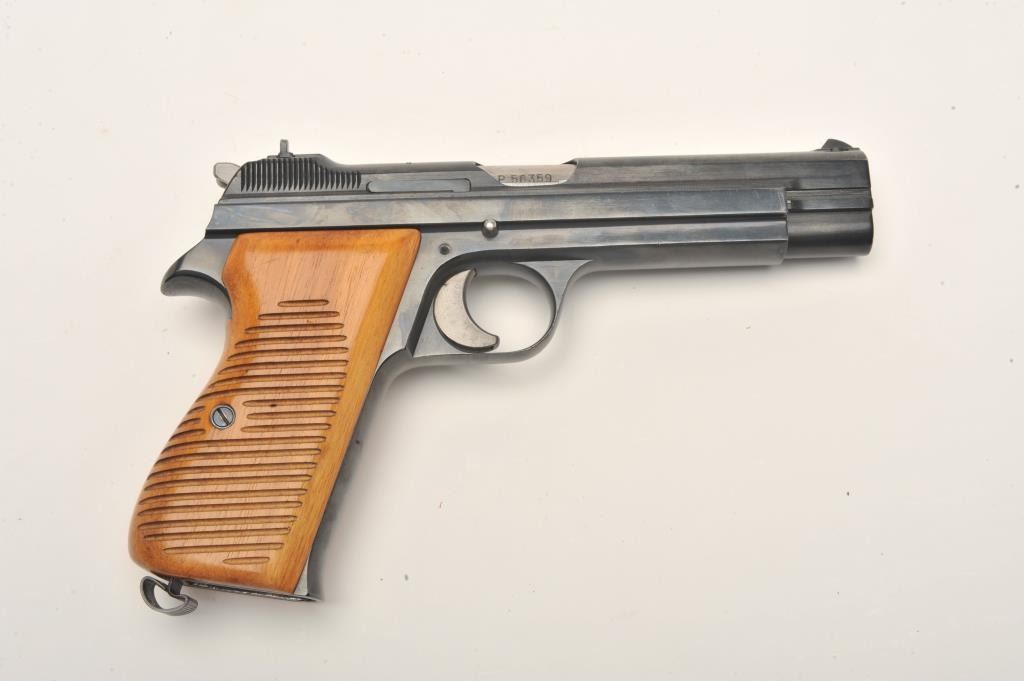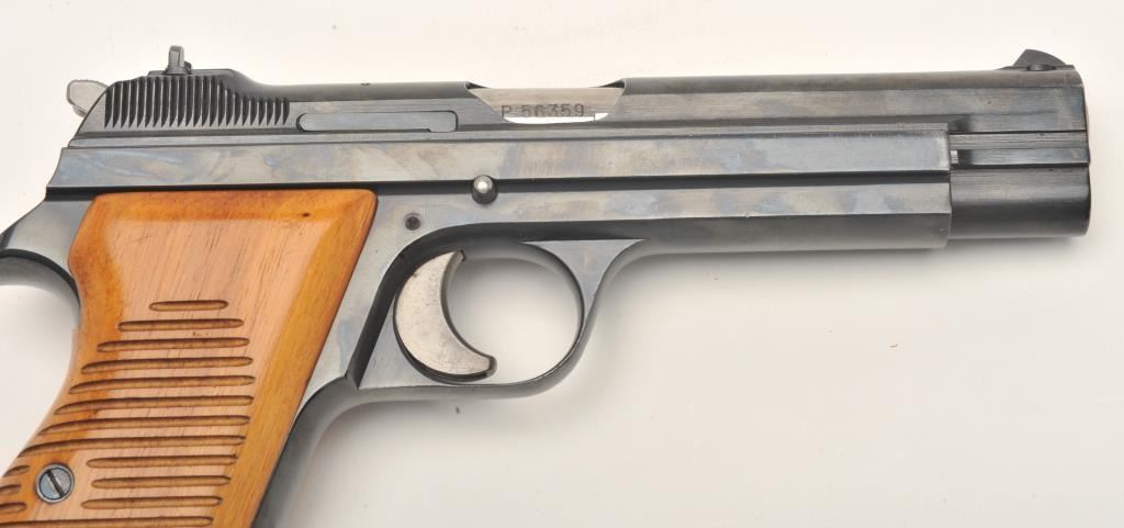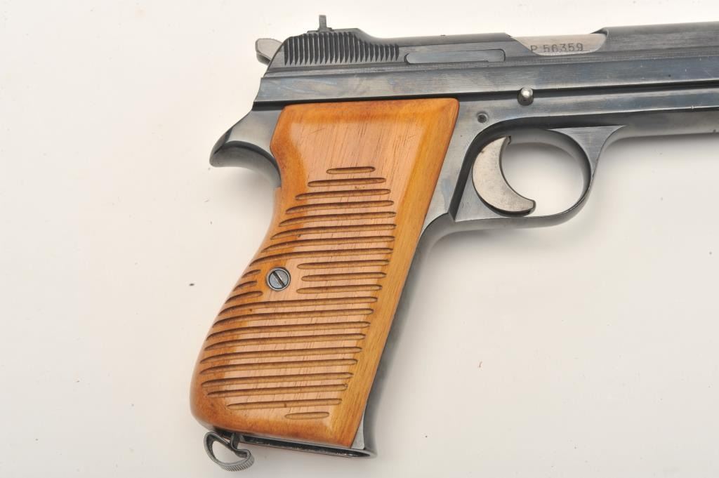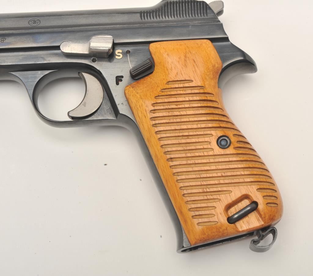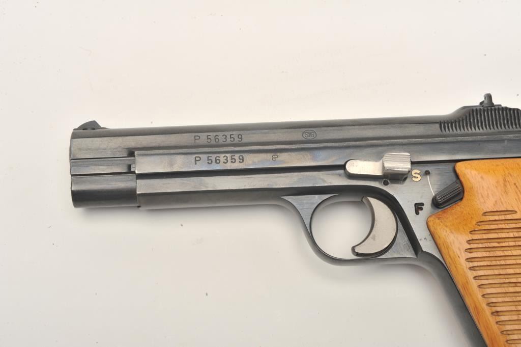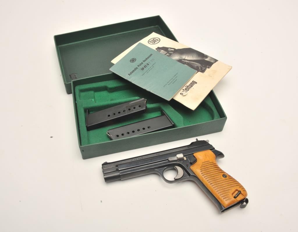 Sig Model P210 semi-automatic pistol, no visible import marks, 9mm caliber, 4.5” barrel, high polish blued finish, wood grips, S/N P56359, in factory two-piece cardboard box with instruction manual and one extramagazine. This very desirable Sig Model is in overall excellent condition displaying minimal use or handling; excellent bore, action, markings and grips. (Modern/PPT). Est.: $2,500-$5,000.