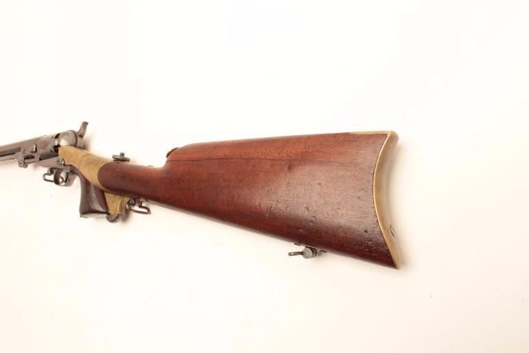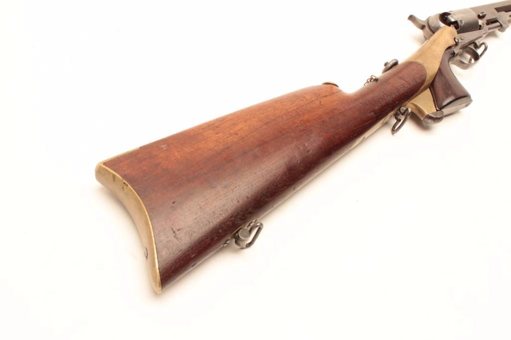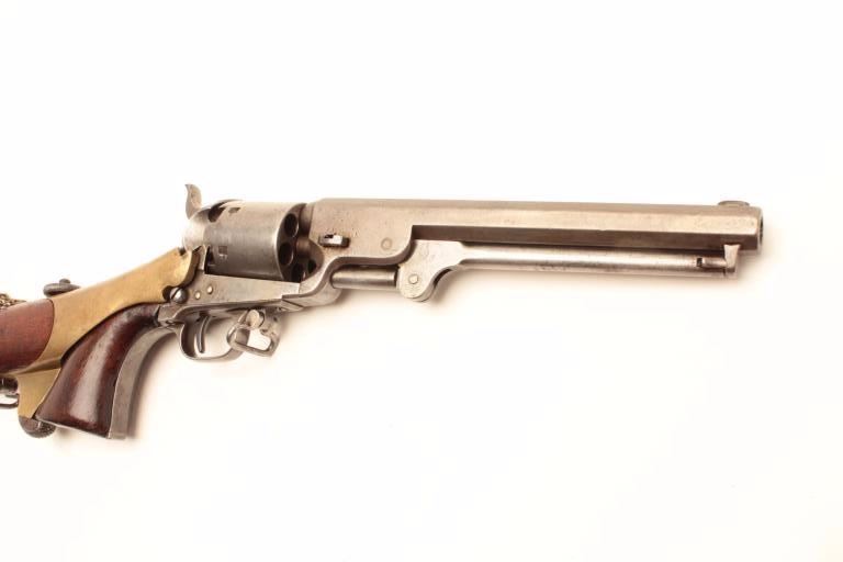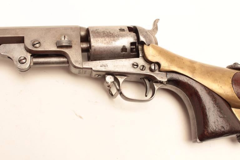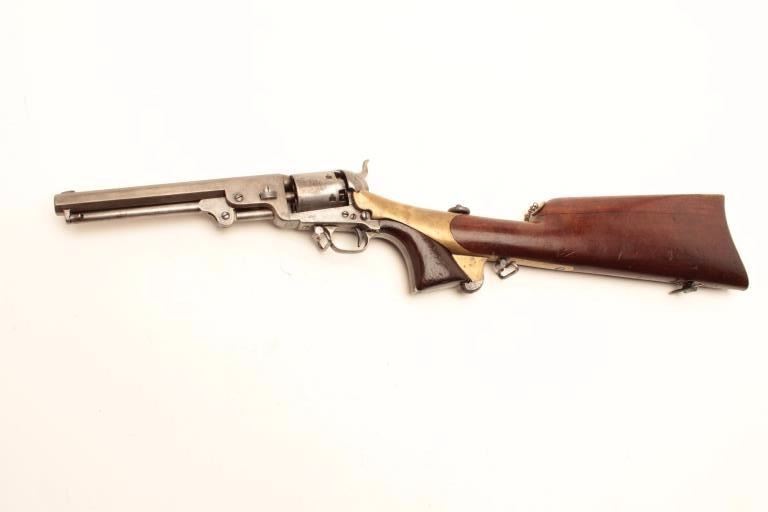 Colt 1851 Navy revolver 4 screw variation with rare and original matching canteen shoulder stock and both are numbered 75449. This revolver remains in good original condition showing light cleaning andpolishing to gray metal finish. The markings are good and the edges are fairly crisp. The cylinder shows faint traces of the scene with Sept. 10 1850 patent markings on the cylinder. Scattered light pitting and goodaction. The front sight is an old hand made blade to match the enlarged “V” notch in the hammer. Correct swivel and 4th screw for stock attachment retained. All matching except no visible serial number on thecylinder (Never stamped). The original canteen stock is in very good plus condition with long cracks at the top of the stock from interior canteen. The numbers on the yoke, attachment jaw and butt plate are matching.Strong traces of silver with only minor dents. Original screw top for jaw, original plug and chain for canteen are still retained. One of the rarest and most desirable of all stocked Colt’s with very few