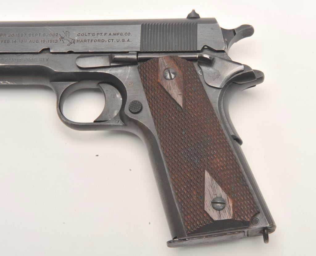 Colt Model of 1911 U.S. Army semi-auto pistol, .45 caliber, Serial #420248. The pistol is in fine overall condition. The pistol retains the majority of its blue finish with high point edge wear, muzzle wear and some loss of finish on the slide noted. The checkered wood grips are in very good condition with small mars, compressions and a lanyard ring on the butt. The bore is very good, the markings are sharp and the actionis crisp. The right side of the frame is U.S. property marked. The lot includes a Colt factory letter confirming the listed features and indicates the pistol was shipped to the United States Government at the BushTerminal, Brooklyn, New York on August 19, 1918 as part of a shipment of 10,000 guns. The lot includes one correct magazine. From the estate of Larry Gaertner. Est.: $1,250-$2,500. (C+R)